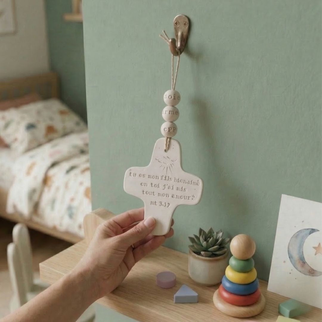 Un geste qui traverse le temps : Pas un cadeau qu'on oublie. Une croix artisanale gravée de la Parole de Dieu, qui traverse les années et grandit avec celui qui la reçoit.