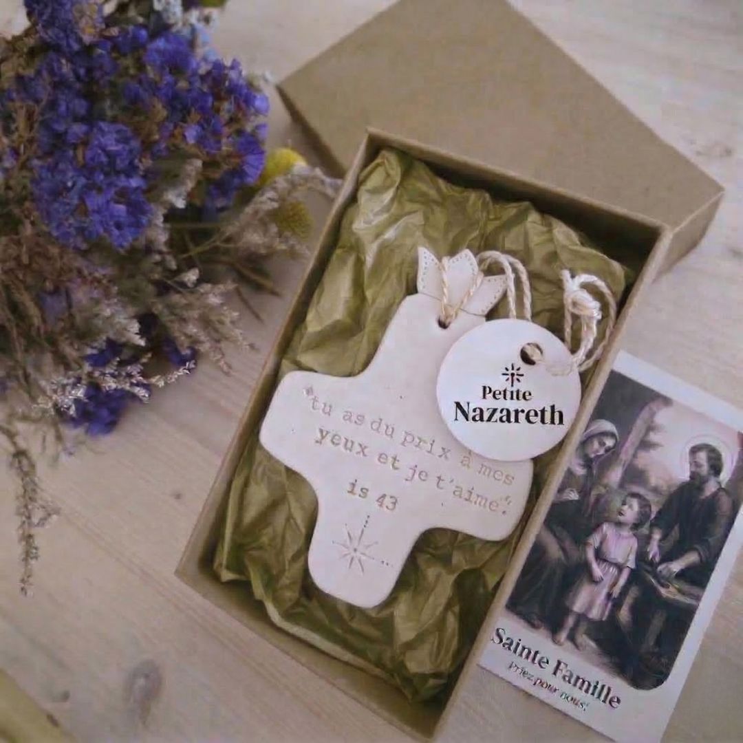"Très très bel objet, d'une grande sensibilité dans la réalisation (on voit la patte de la créatrice) et d'une grande profondeur dans sa signification. J'ai été émerveillée d'ouvrir mon petit colis ce soir, mon fils est en adoration devant cette douce croix qui orne désormais sa chambre 🥰."