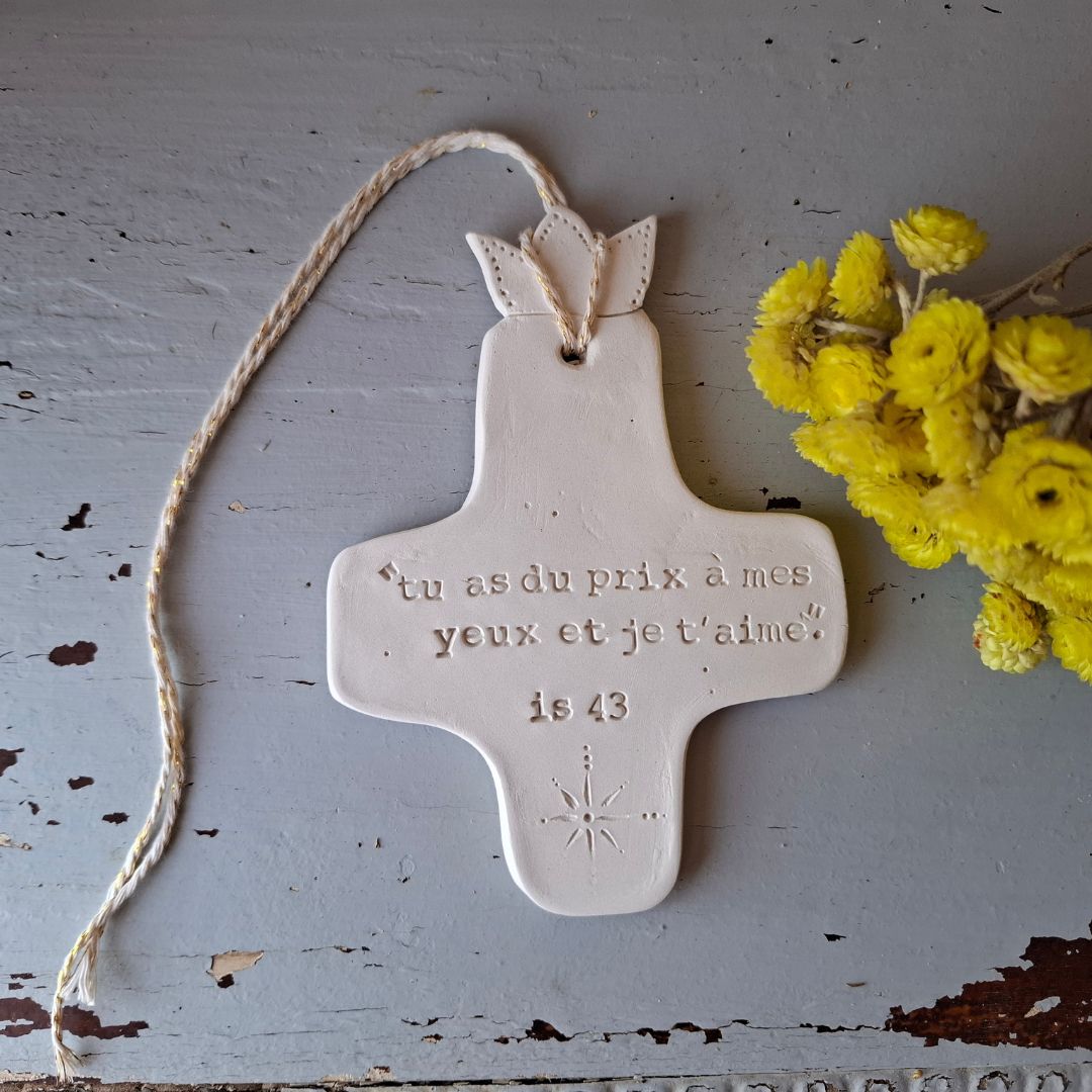 Croix en céramique gravée "tu as du prix à mes yeux et Je t'aime" Isaïe 43-4.