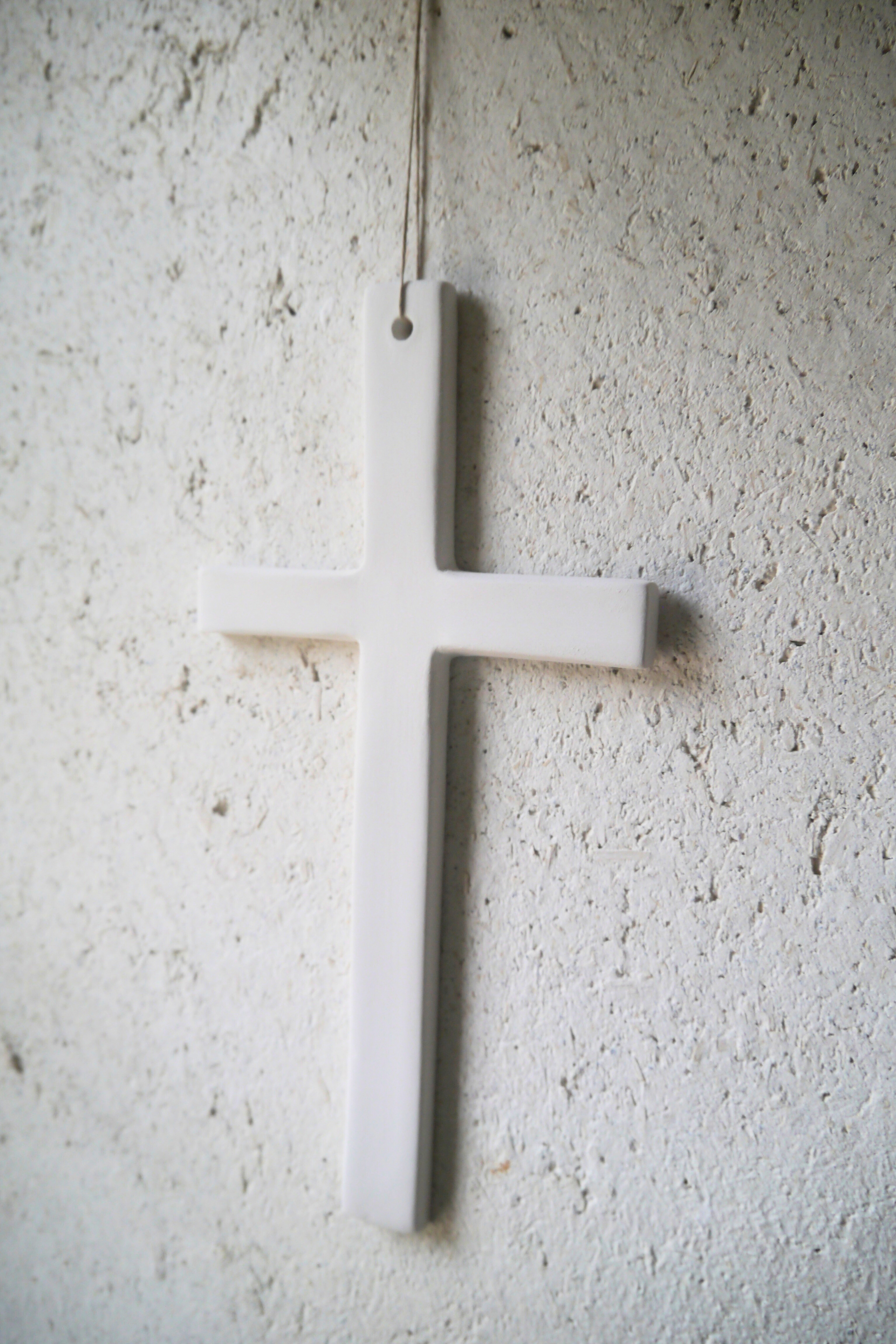 Croix en céramique faite à la main; à suspendre dans son coin prière ou à offrir pour un baptême (filleul), une première communion, une profession de foi, une confirmation, un mariage, ou tout simplement à un proche croyant.