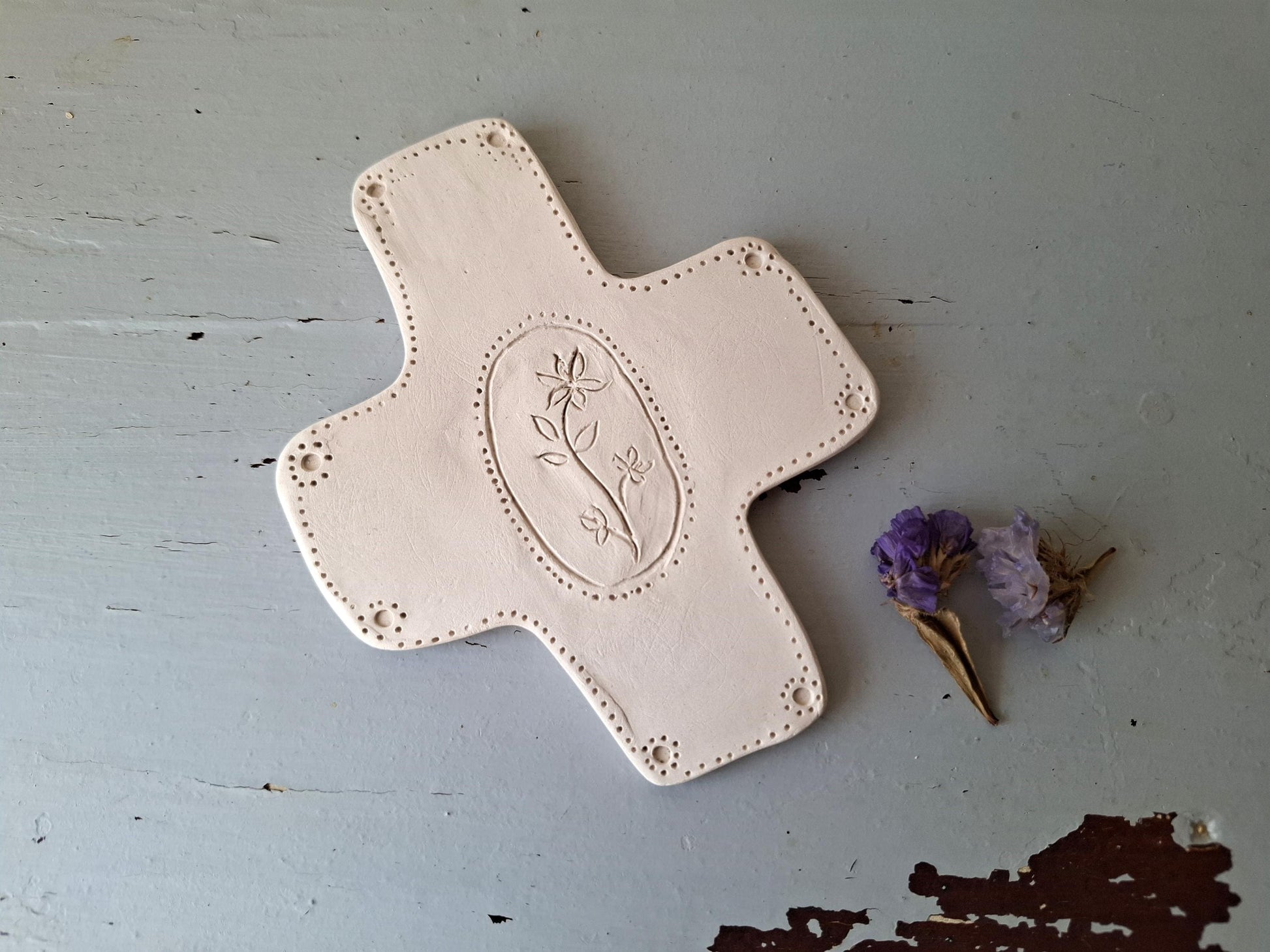 Croix en céramique, pièce unique faite à la main; à suspendre dans son coin prière ou à offrir pour une cadeau plein de sens et d'attention. Le psaume, la citation de la Bible, ou la prière qui y est inscrite, puisée du trésor chrétien, invite à l'intériorité, à la prière.