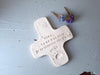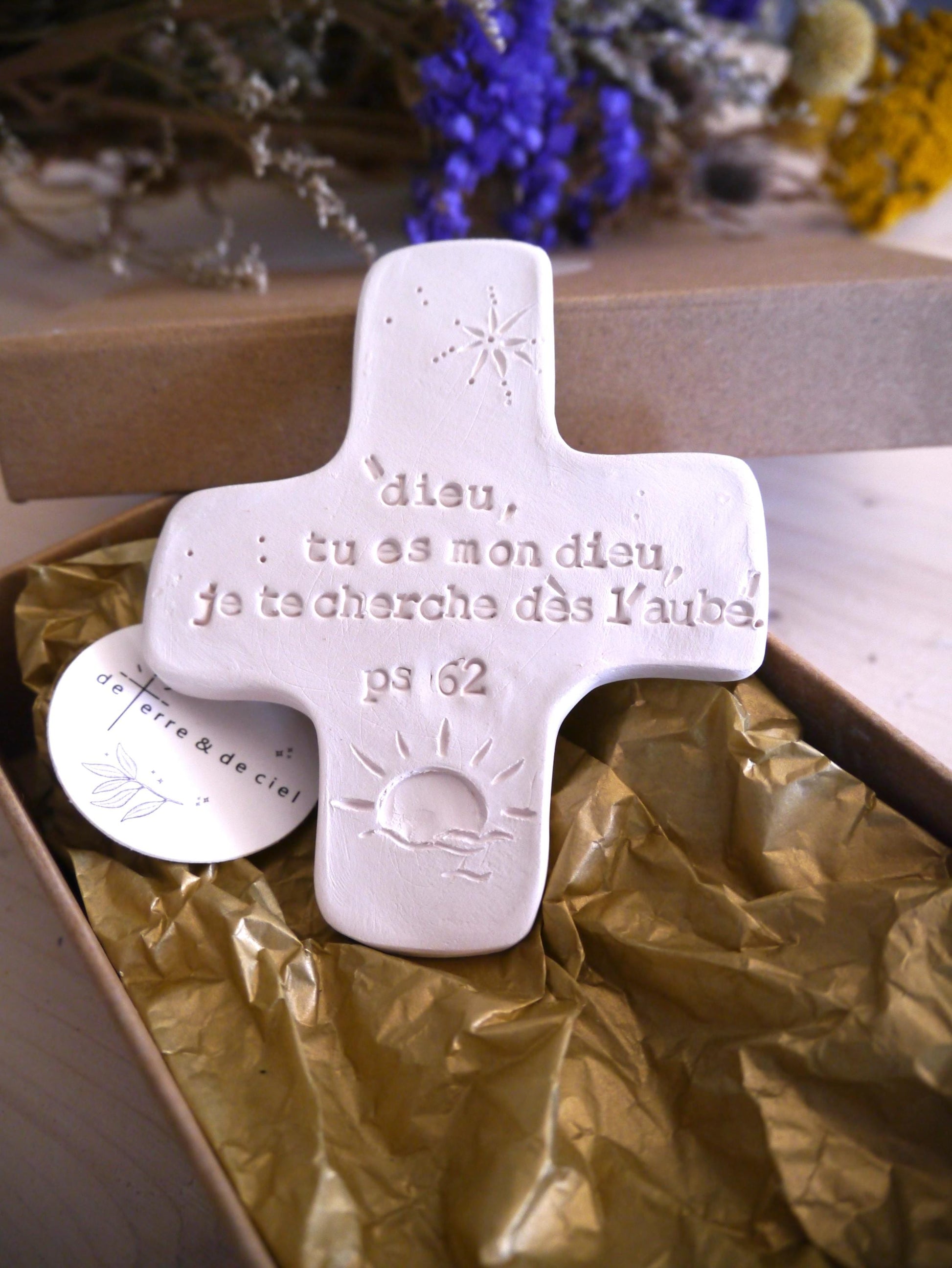 Croix en céramique, pièce unique faite à la main; à suspendre dans son coin prière ou à offrir pour une cadeau plein de sens et d'attention. Le psaume, la citation de la Bible, ou la prière qui y est inscrite, puisée du trésor chrétien, invite à l'intériorité, à la prière.