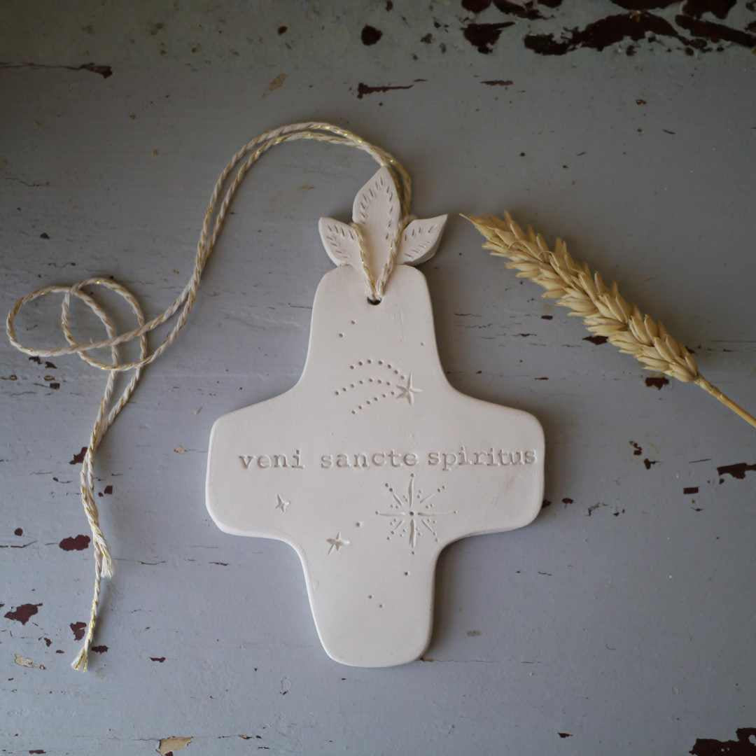 Croix en céramique gravée "Veni Sancte Spiritus"