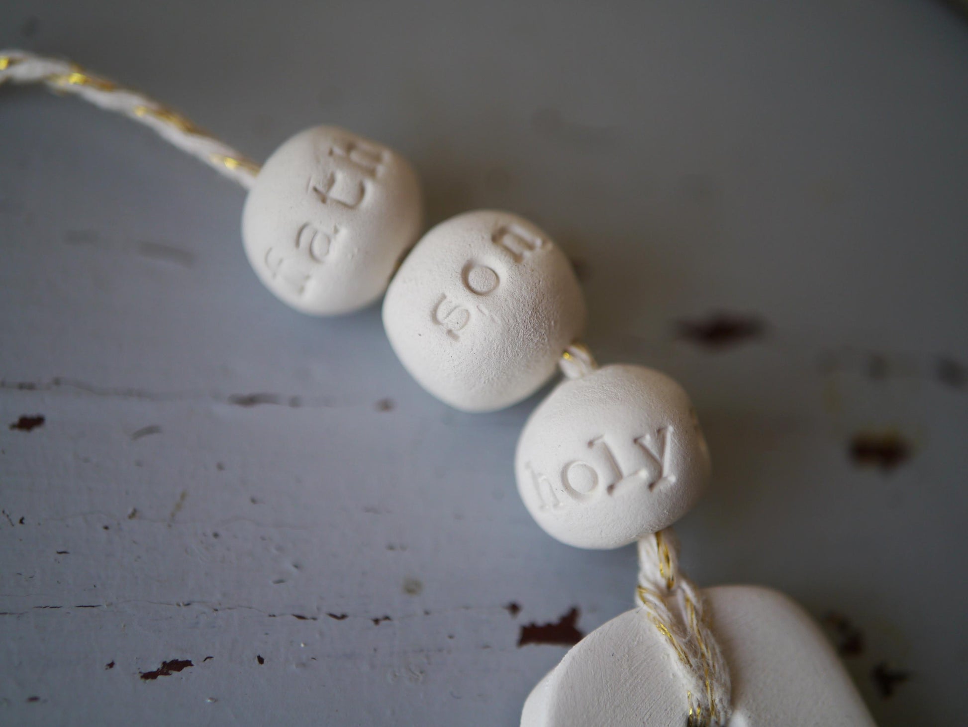 Dimensions: environ 10x9 cm. 3 perles: father/son/holy spirit. Attache: lien écru/doré