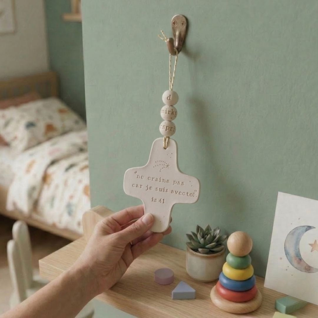 Un geste qui traverse le temps : Pas un cadeau qu'on oublie. Une croix artisanale gravée de la Parole de Dieu, qui traverse les années et grandit avec celui qui la reçoit.