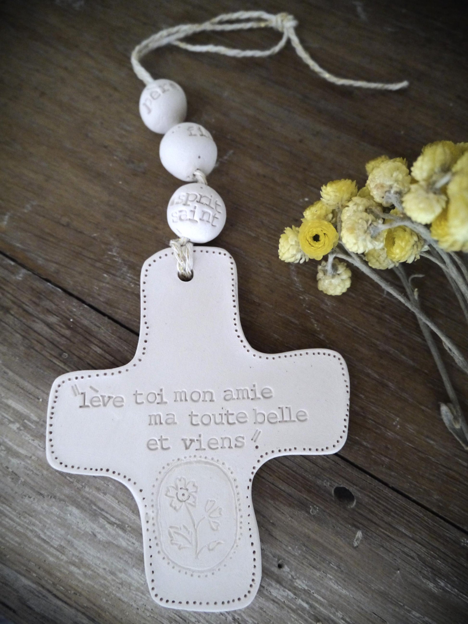 Croix en céramique, pièce unique faite à la main; à suspendre dans son coin prière ou à offrir pour une cadeau plein de sens et d'attention. Le psaume, la citation de la Bible, ou la prière qui y est inscrite, puisée du trésor chrétien, invite à l'intériorité, à la prière.