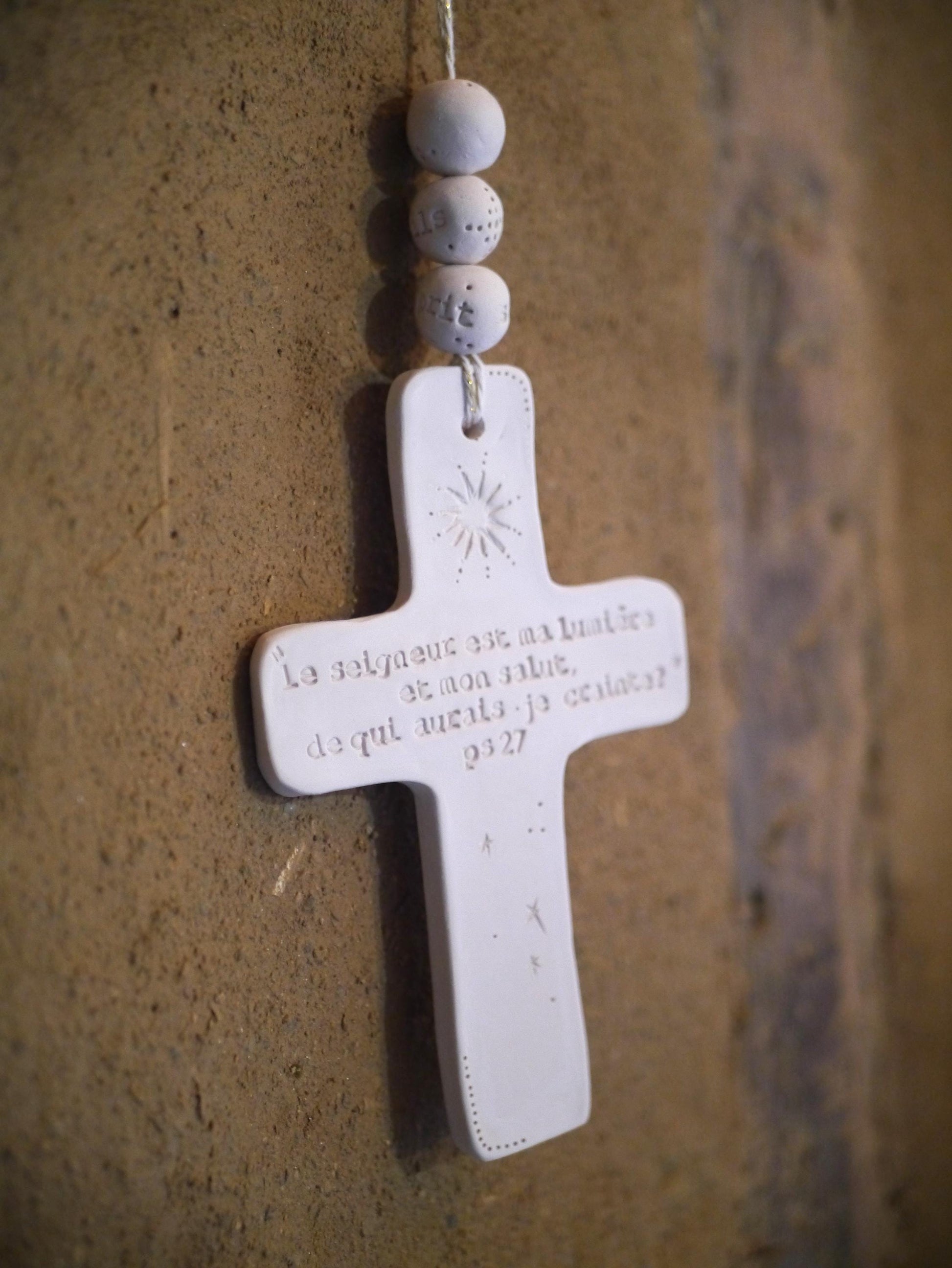 Croix en céramique, pièce unique faite à la main; à suspendre dans son coin prière ou à offrir pour une cadeau plein de sens et d'attention. Le psaume, la citation de la Bible, ou la prière qui y est inscrite, puisée du trésor chrétien, invite à l'intériorité, à la prière.